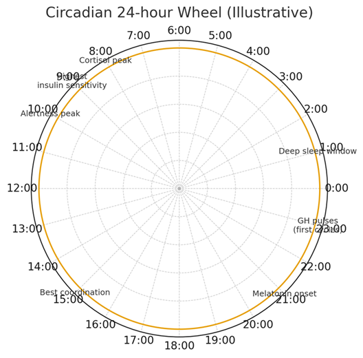 Figure 1. Illustrative 24‑hour circadian wheel showing approximate timing of common physiological peaks.