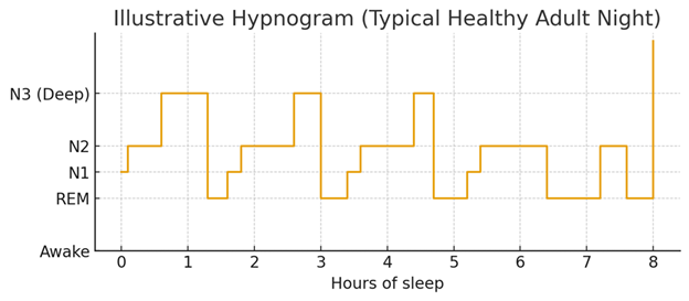 Figure 2. Example hypnogram: deeper N3 early in the night, longer REM episodes toward morning.