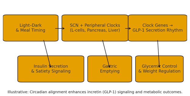 Figure 3. Conceptual pathway: light–dark and meal timing entrain peripheral clocks that gate GLP‑1 secretion and downstream metabolic effects.