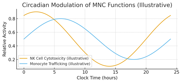 Figure 4. Illustrative circadian modulation of NK function and monocyte trafficking across 24 hours.